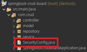com.crud 패키지 안에 SecuriyConfig.java 파일을 생성합니다.