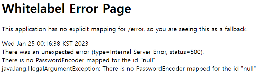 이것은 PasswordEncoder 가 연결이 되어있지 않아서 발생하는 문제인데