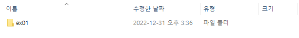 ex01 이라는 디렉토리를 하나 만든 뒤 이 디렉토리에서 마우스 우클릭을 해서 나오는 Git Bash Here 을 클릭합니다.